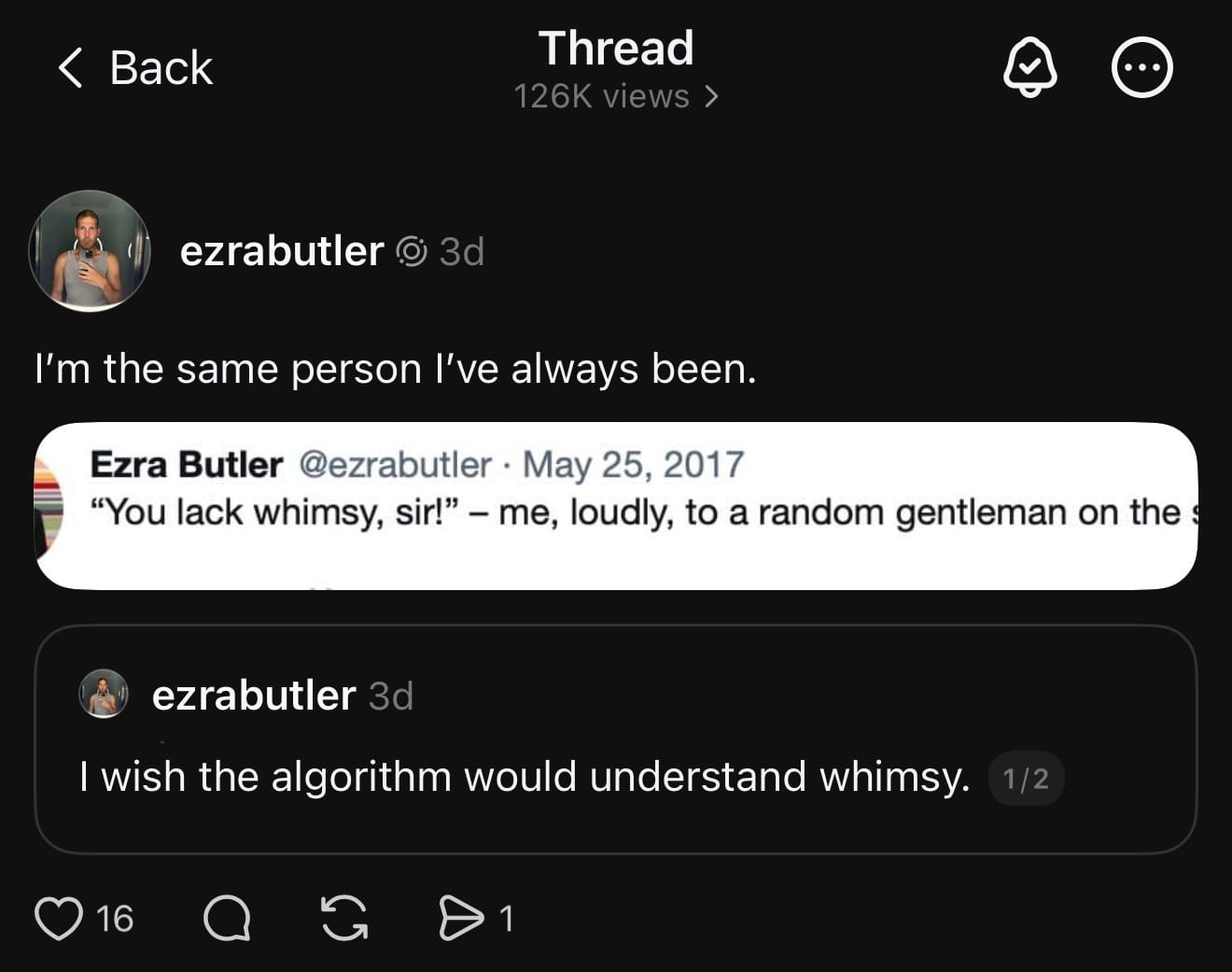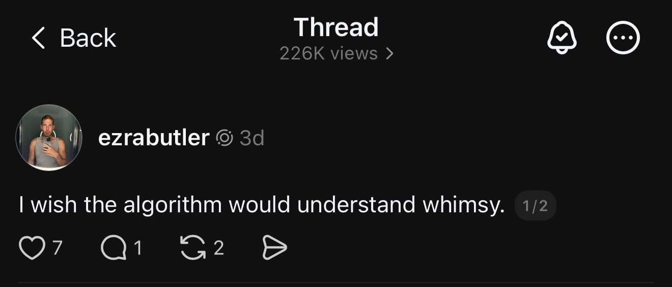 The problem is, in order to even access one's audience on Threads, you have to get through the algorithm. And if you successfully game the algorithm, you are not being your authentic self. Therein lies the problem
