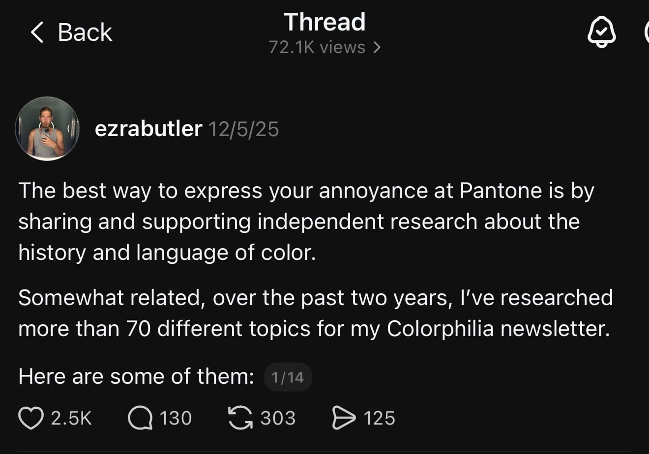 A few months ago, I had a thread which went "viral", with authentic engagement, in which I included a list of a dozen newsletters about the history and language of color which I had written over the past two years. The first post of the thread received more than 72k views, 2.5k likes, 130 comments, 303 reposts and 125 shares. From that thread, I got more than 1000 new followers and more than 100 new newsletter subscribers, including a single new paid newsletter subscriber.