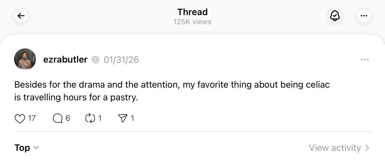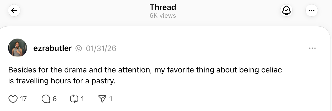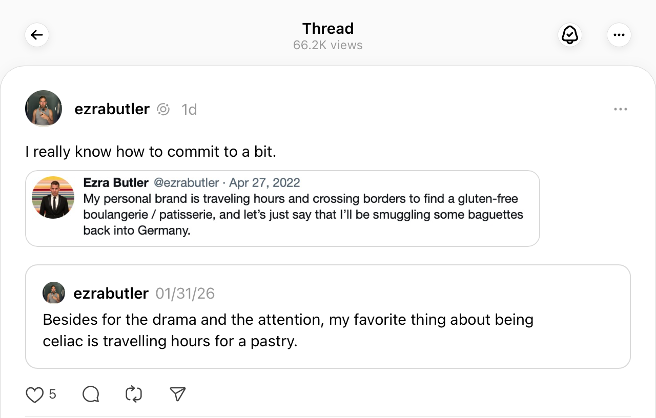 Ten days later, I quote-posted a screenshot from Twitter, from the time I smuggled illicit gluten-free baguettes from Strausborg to Baden-Baden, strictly for personal use. It racked up 66.2K views in less than a day.